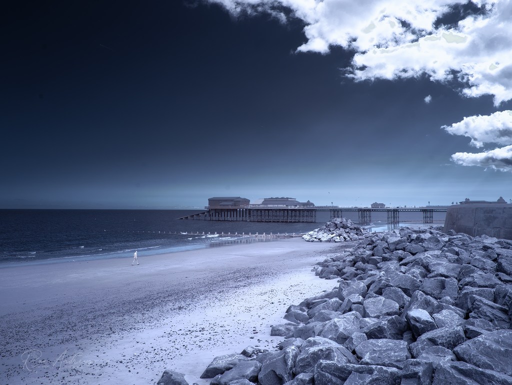 Cromer Pier stretches across the frame in quiet grandeur, its silhouette balanced by the hefty rocks in the foreground. A single figure walks along the sand below, glowing faintly in the infrared spectrum. The beach is pale, almost lunar, while the sea lies calm and dark beyond. The sky above is vast and deep, almost indigo, with an eruption of bright white cloud curling over the scene like smoke.