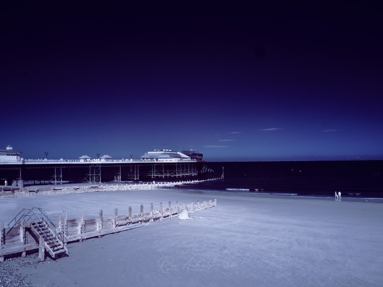 A wide infrared shot of Cromer Pier, rising from the bright sands like an elegant silhouette. The pier’s ironwork legs stretch into the sea, supporting the ghostly pale buildings above. In the foreground, a geometric arrangement of sea defences and steps leads the eye out toward the horizon. The sky above is deep violet, the sea a midnight blue, and the entire beach seems bathed in cold light … ethereal, empty, dreamlike.