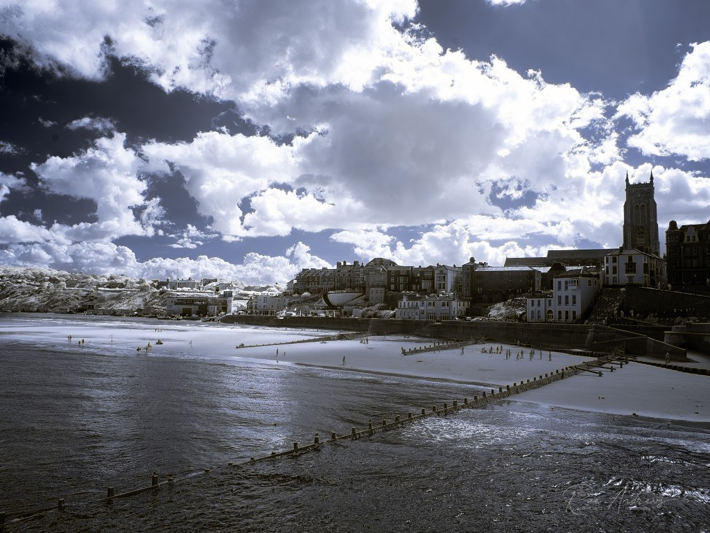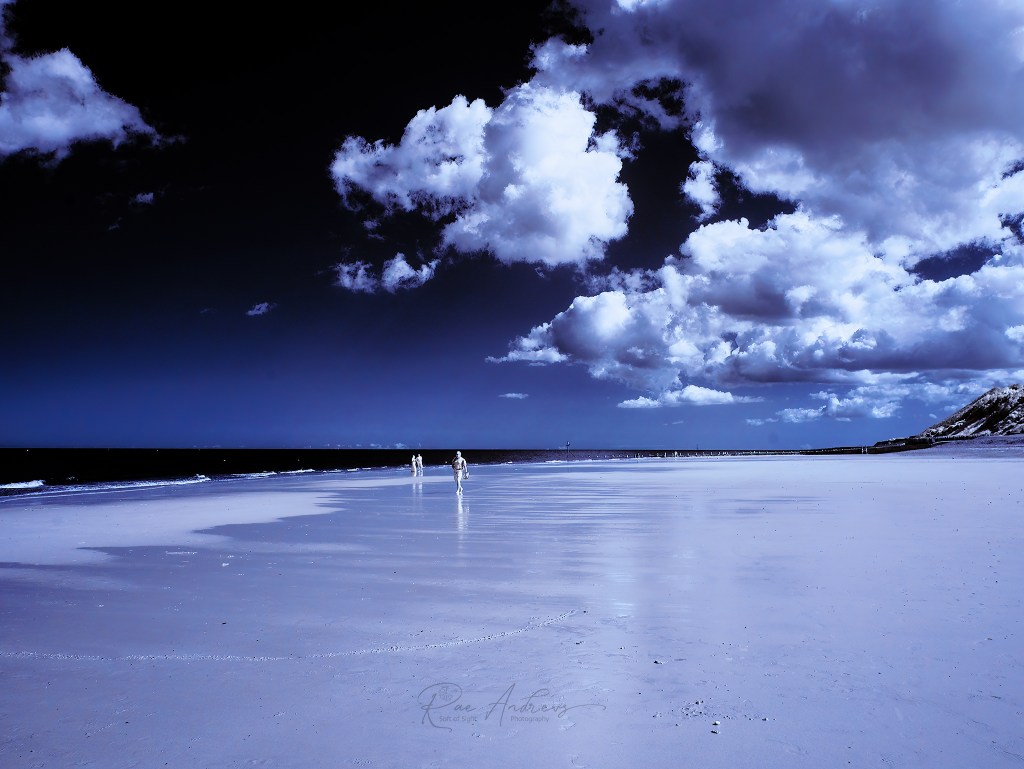 An infrared seascape taken at low tide on Cromer beach. The wet sand reflects the sky like a mirror, stretching far into the distance, where the sea meets the horizon. A handful of pale figures walk along the water’s edge, glowing softly against the dark waves. Above, the sky is immense – a velvet blue expanse scattered with luminous clouds that billow like painted silk. The scene is quiet, otherworldly, as though caught in a lull between time and tide.