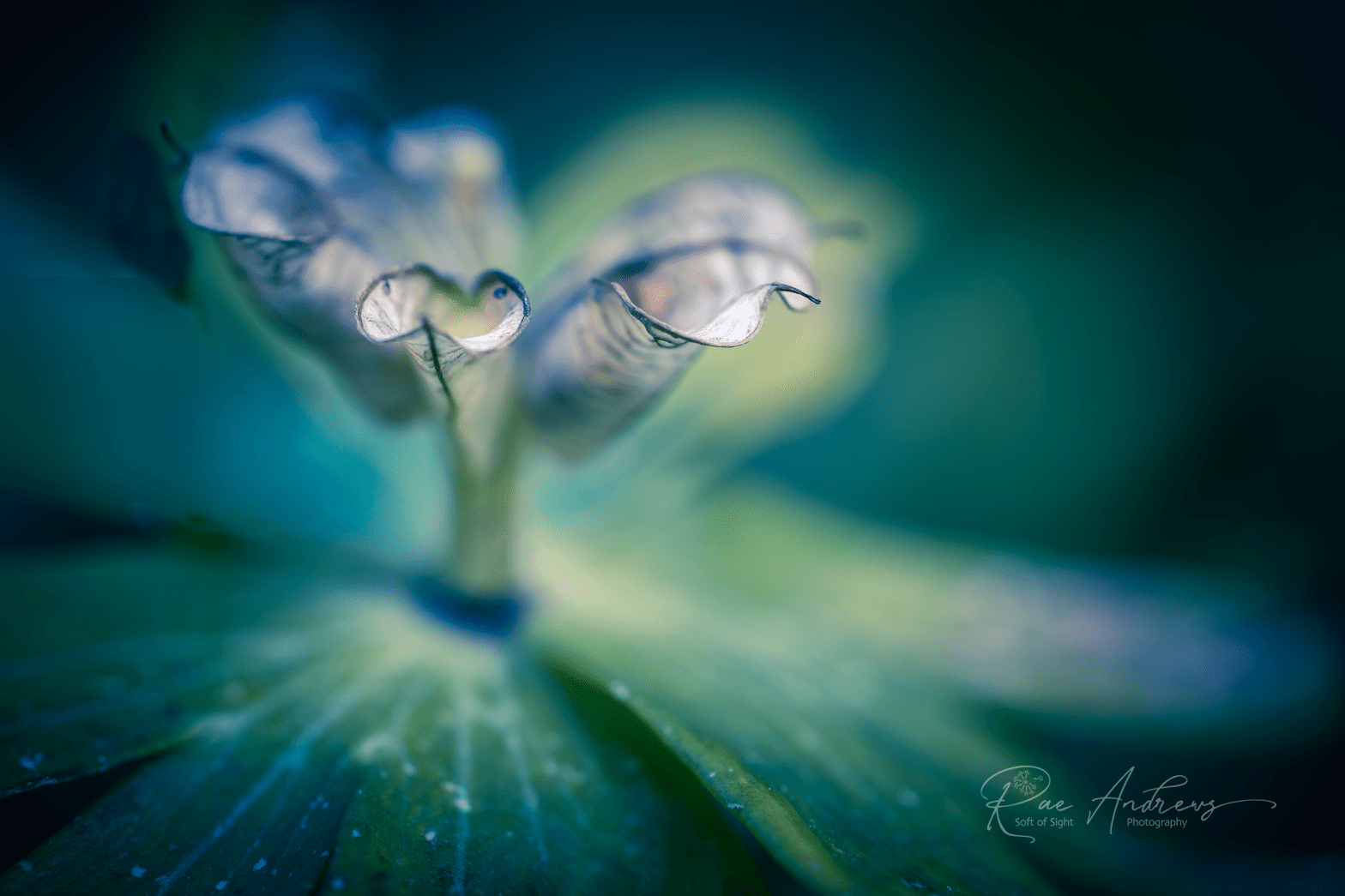 Nodding their white and green fringed heads the gentle snowdrops nestle in the deep green of the woods. Beyond them bokeh balls of white light in the blue green haze hint at the brighter sunlight beyond the trees.