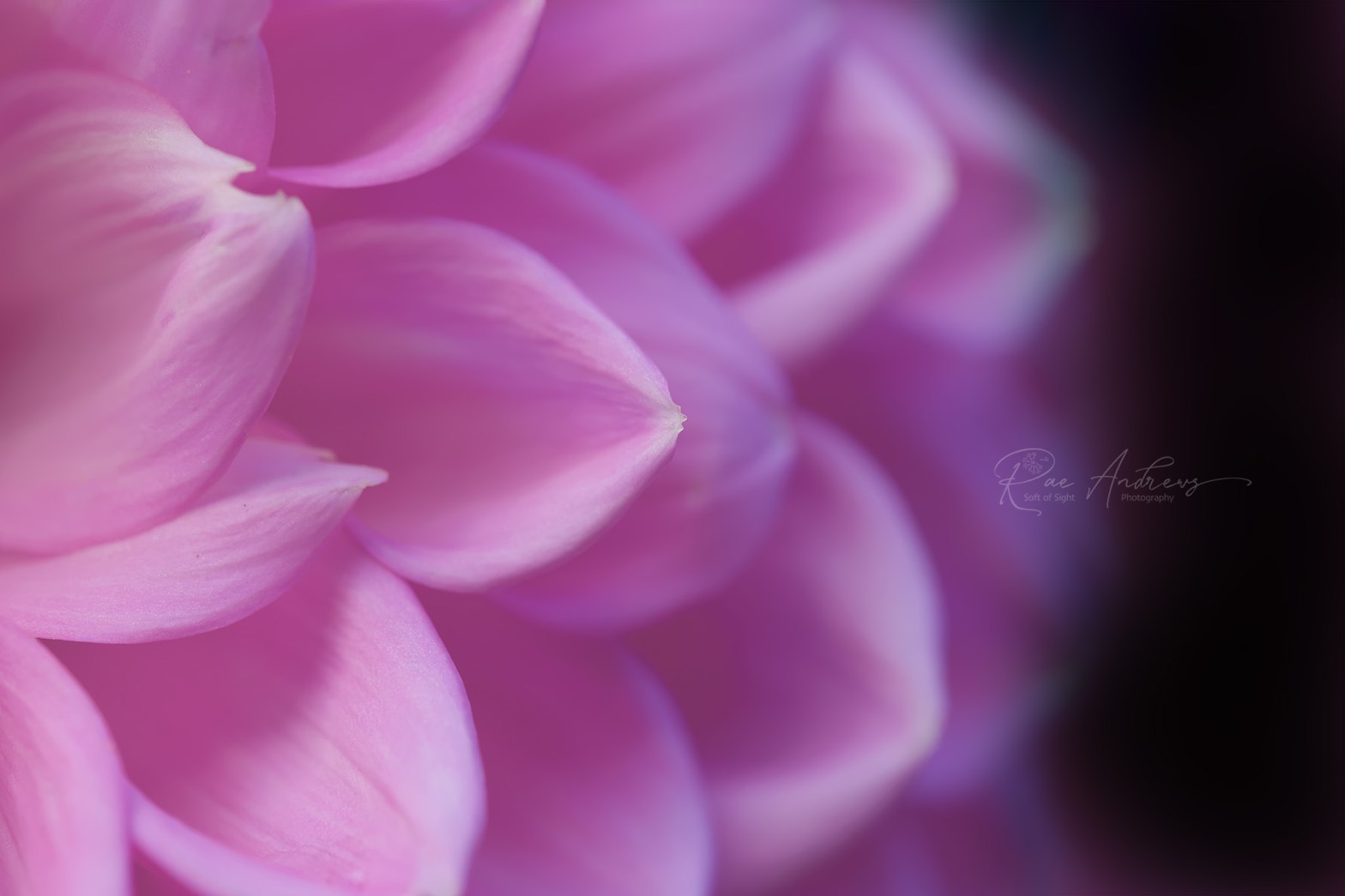 A close-up macro image of a pink dahlia, its petals unfolding in layers like silky satin shells. The focus is tight on the tip of a single petal, with the rest of the bloom dissolving into a creamy blur of pink and lilac tones, shadowed in the cup of the petals. The image glows with… Continue reading Ballerina Pink