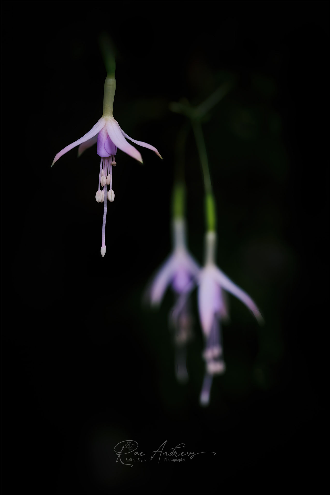 A delicate fuchsia in palest pink hangs like a tiny lantern in the dark, its petals reaching out like outstretched arms while long, slender stamens fall gracefully below. Softly blurred in the background two siblings add a whisper of companionship. The deep black backdrop makes this little flower glow as if lit from within –… Continue reading Tiny Dancers