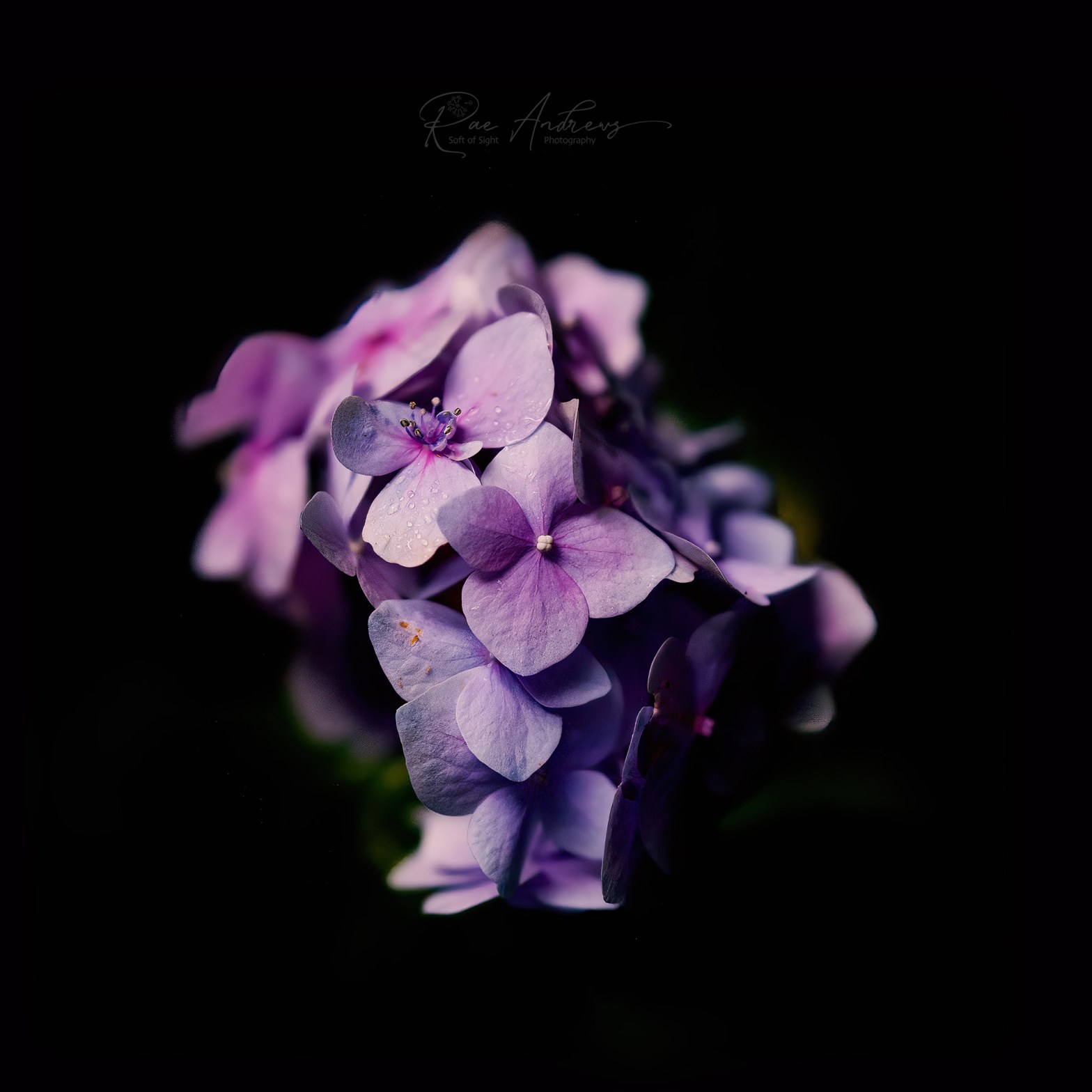 Emerging from darkness are lilac pink hydrangea flowers, their four petalled blooms crowding together and fighting for attention. Their texture looks almost papery, and the delicate reaching stamens at the centre a gentle purple.